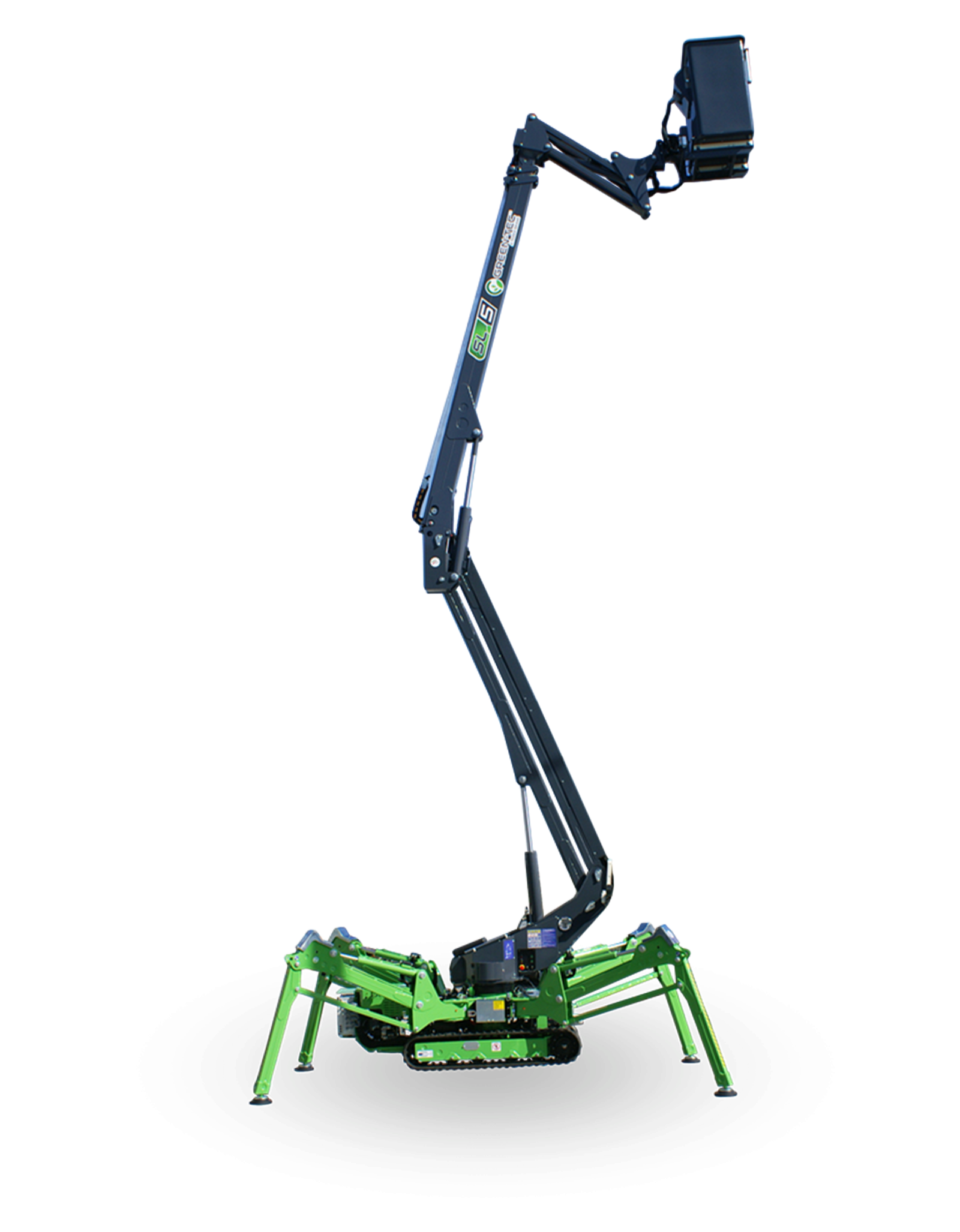 Plataforma elevadora tipo ‘spider’ para trabajos en altura en espacios reducidos. Orugas de goma, estabilizadores ajustables y nivelación automática para acceso seguro y eficiente en poda y mantenimiento.