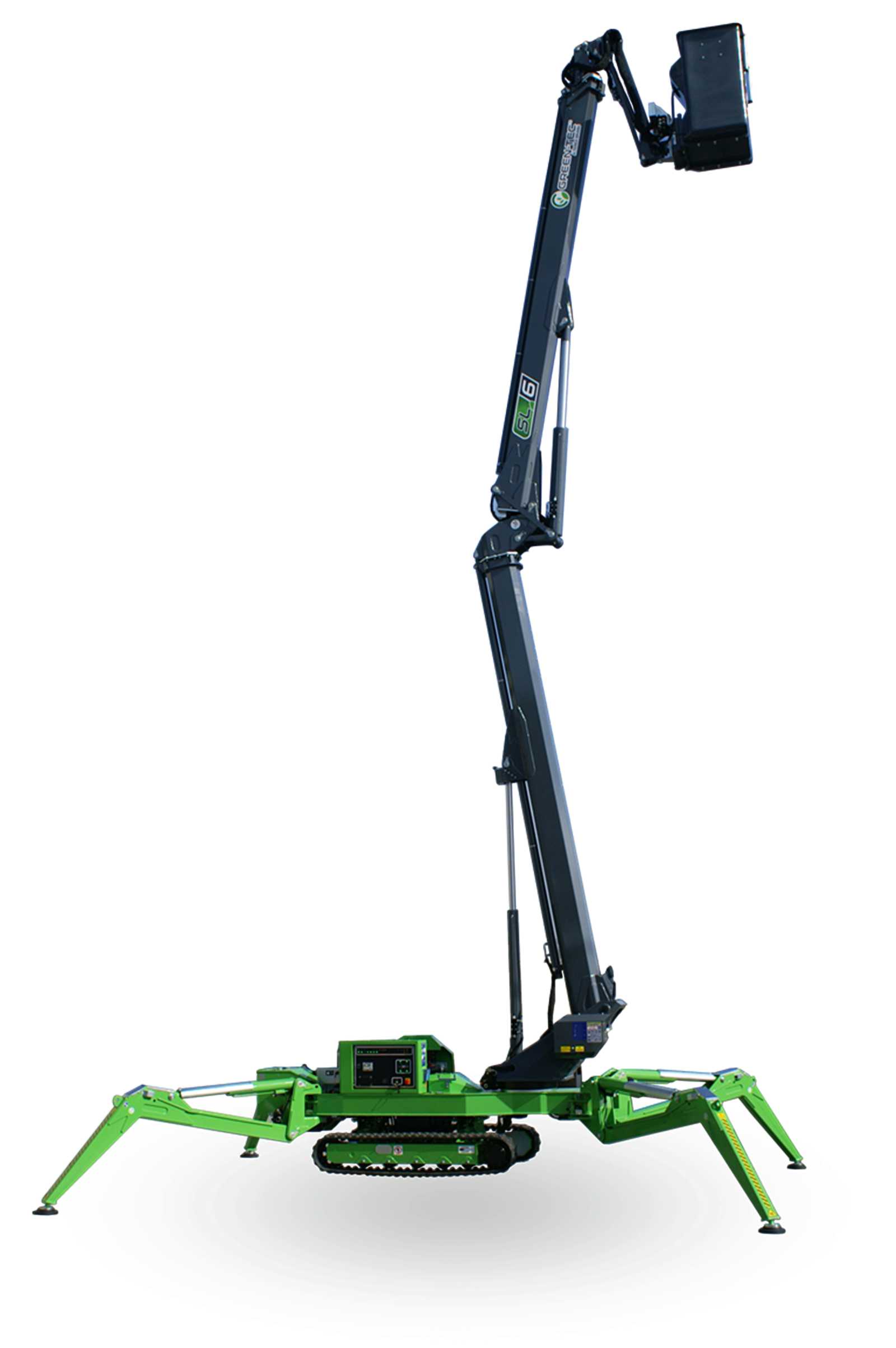 Plataforma elevadora SL6 tipo ‘spider’ para trabajos en altura en espacios reducidos. Orugas telescópicas independientes, estabilizadores ajustables y nivelación automática para acceso seguro y eficiente en poda y mantenimiento.