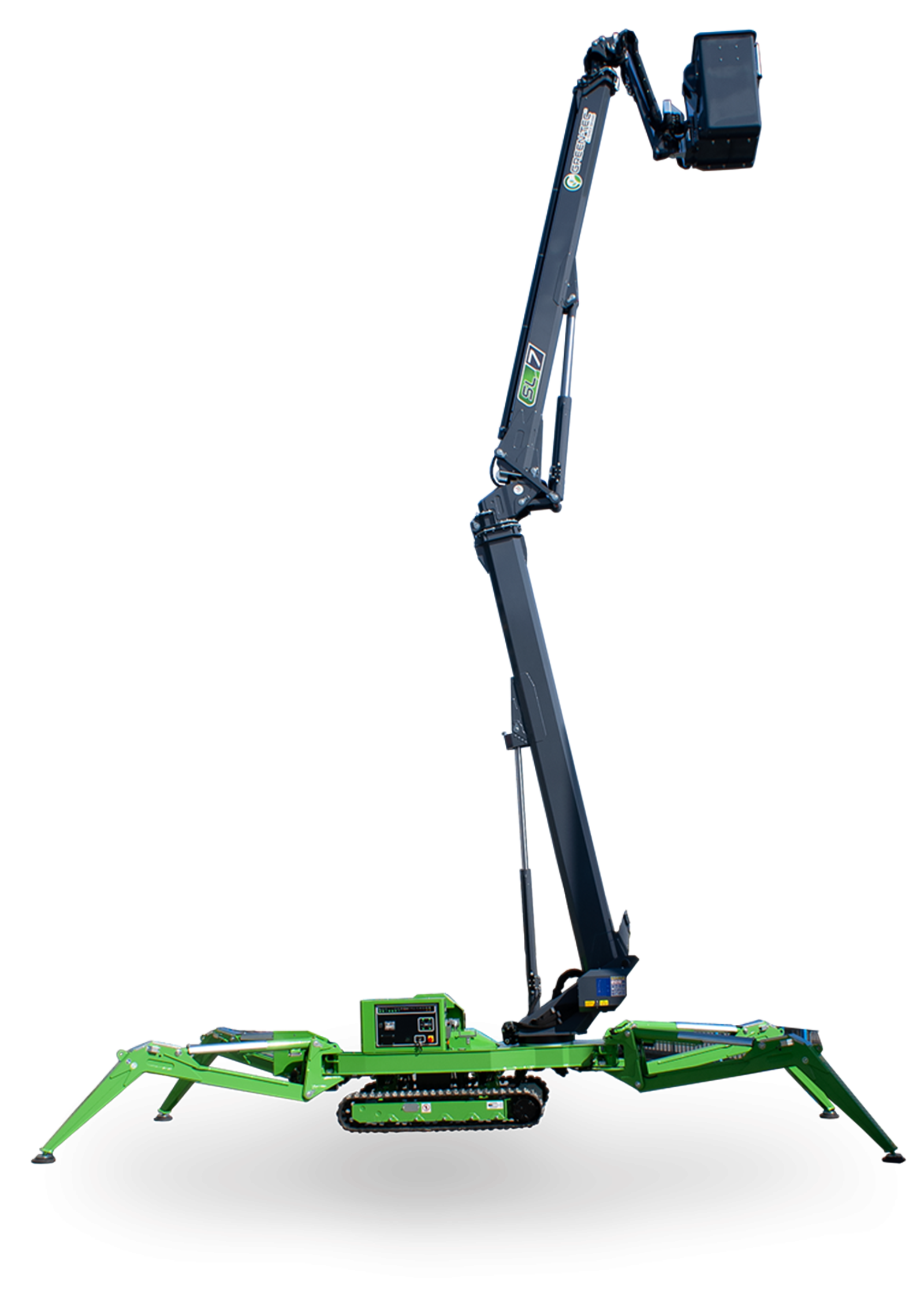 Plataforma elevadora SL7 tipo ‘spider’ para trabajos en altura en espacios reducidos. Orugas telescópicas independientes, estabilizadores ajustables y nivelación automática para acceso seguro y eficiente en poda y mantenimiento.