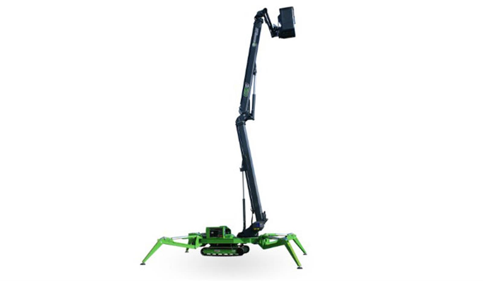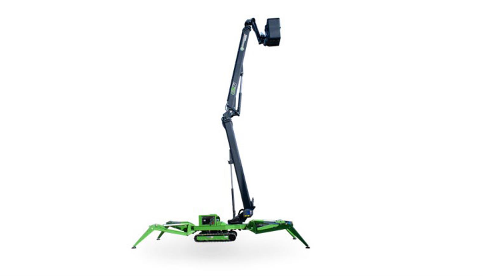 Plataforma elevadora tipo ‘spider’ para trabajos en altura en espacios reducidos. Orugas de goma, estabilizadores ajustables y nivelación automática para acceso seguro y eficiente en poda y mantenimiento.