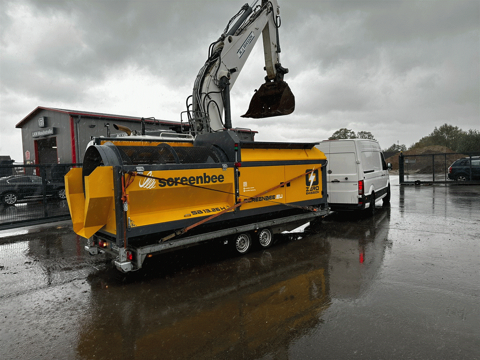 Criba móvil compacta con sistema de gancho (hook lift), diseñada para operación automática y alto rendimiento en cribado de materiales.